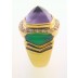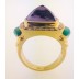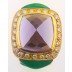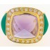 Great looking 18k Yellow Gold Albion looking ring. Center stone is a Pyramid shaped Light pinkish purple Amethyst measuring 13mm x 13 mm x 9 mm. Luscious Green chalcedony opn the sides. The Amethyst is surrounded by .75 ct in diamond that are top white F-G color and top VVS-VS Clarity diamonds. Stamped 18k .75. Size 7 and Sizable. 13.3 Grams . Great gently worn condition.Additional Info
